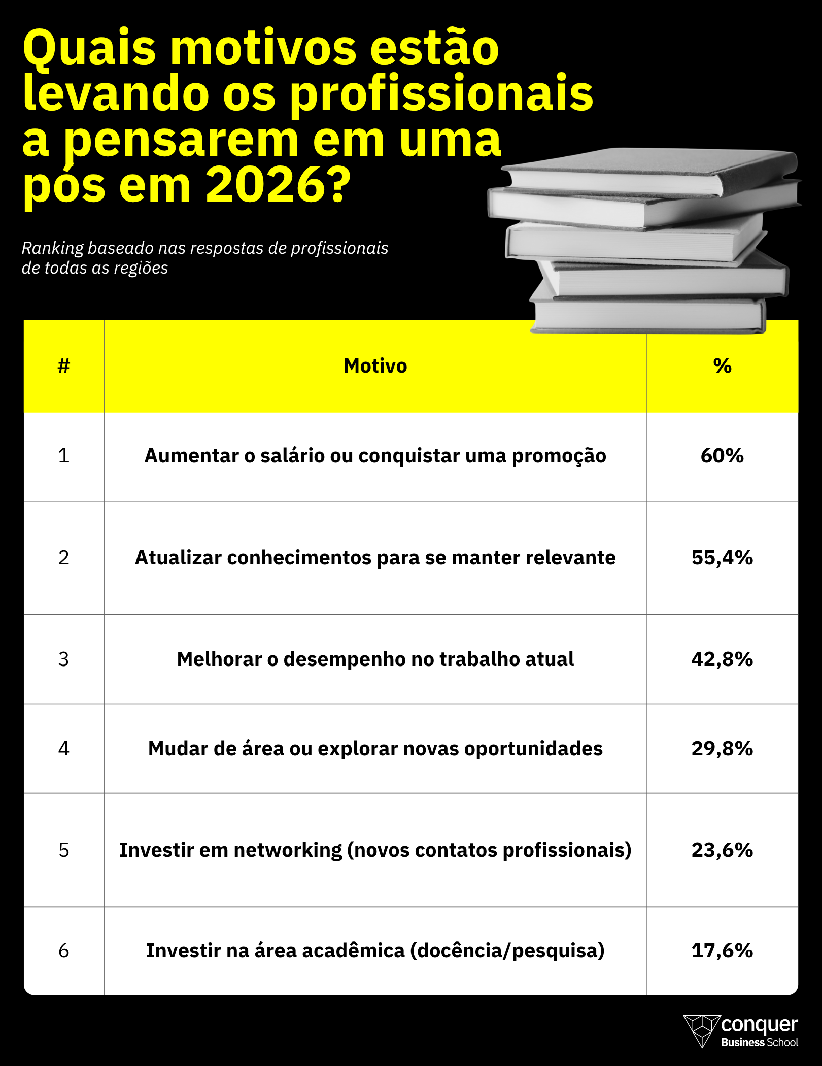- 56% dos profissionais brasileiros pretendem iniciar uma pós-graduação em 2026;