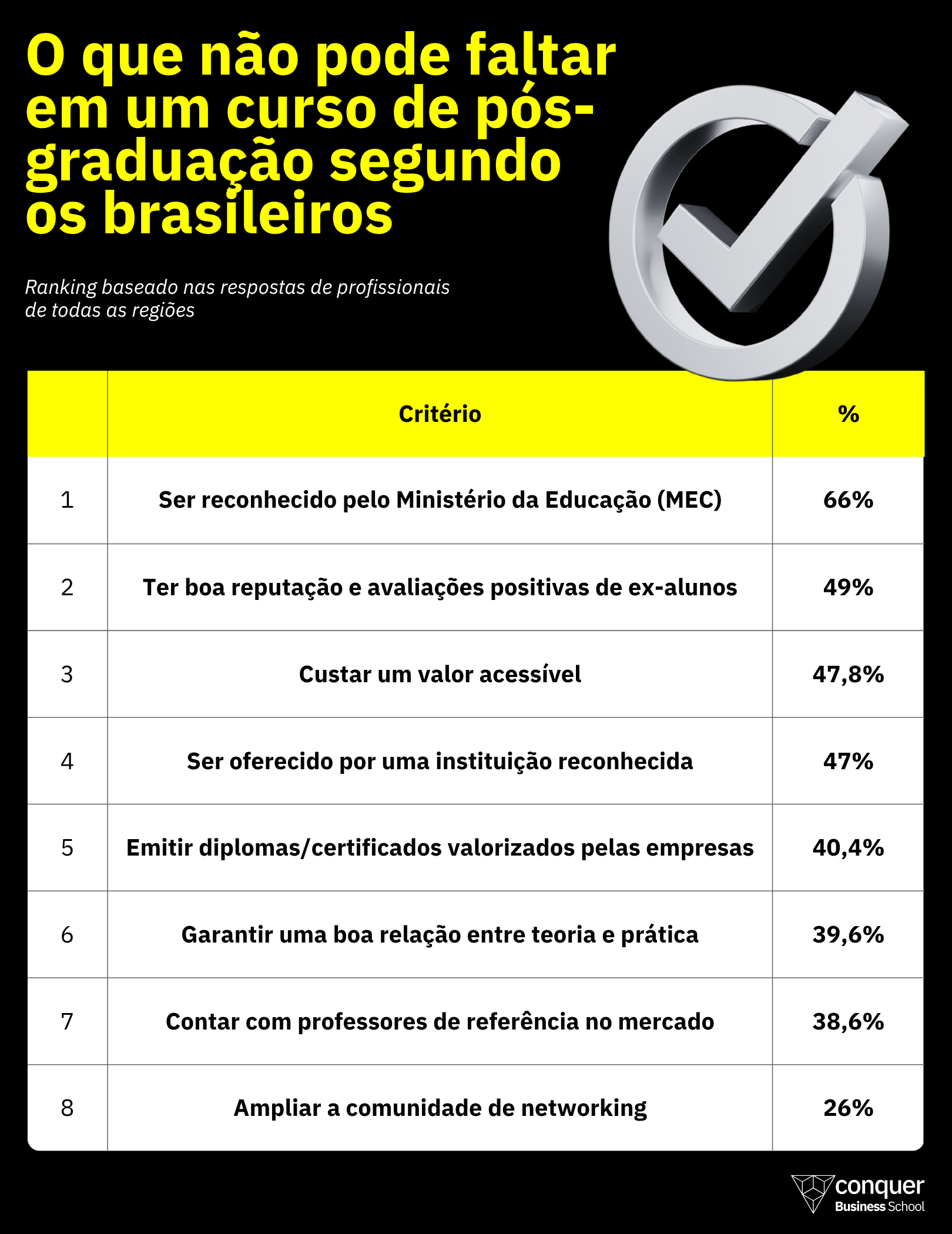 Isso porque, entre os critérios mais avaliados pelos profissionais hoje, estão o reconhecimento do curso de pós-graduação pelo MEC (66%), a reputação e o feedback de ex-alunos (49%) e o valor acessível (48%) — fatores que reforçam a importância da credibilidade na escolha por uma especialização.